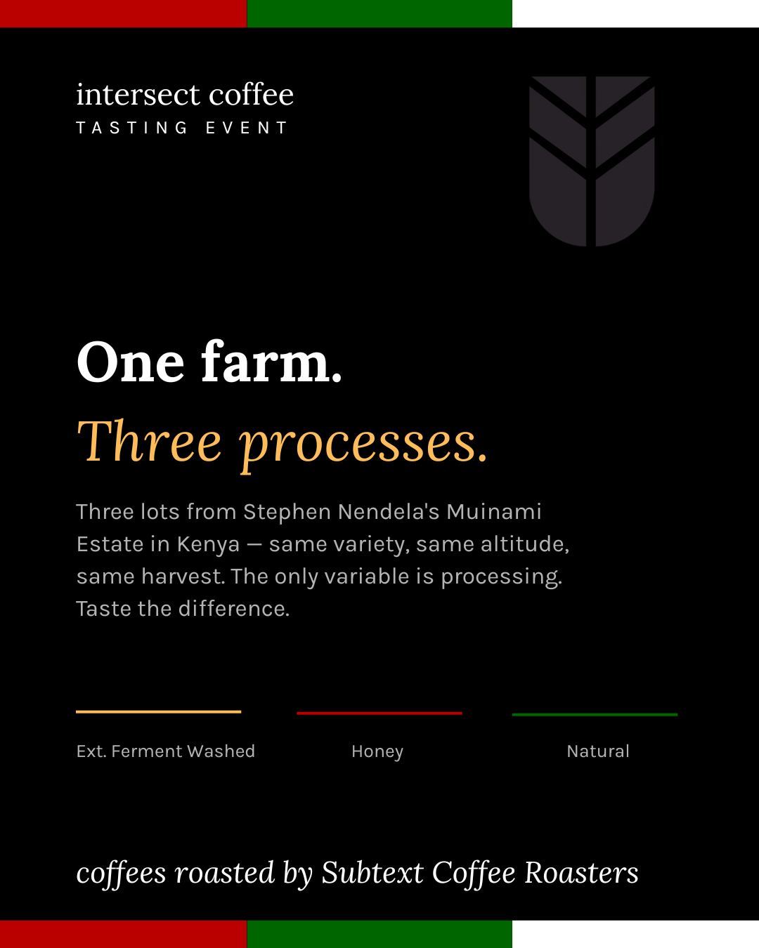 We're brewing three lots from Stephen Nendela's Muinami Estate in Kenya's Western Rift Valley — all the same Batian variety, same altitude, same harvest. The only difference is how each was processed: extended ferment washed, honey, and natural. All coffee is roasted by Subtext Coffee Roasters from Toronto, Ontario, Canada.